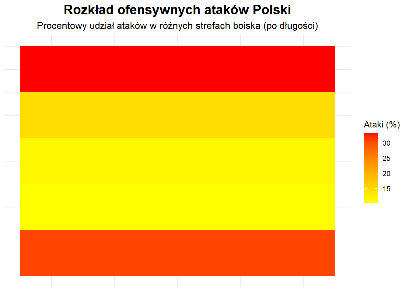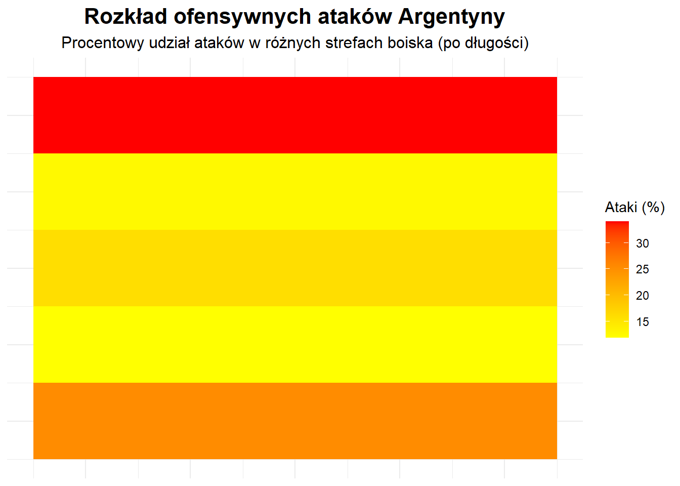 Analizując heatmapy dla reprezentacji Polski i Argentyny, widać wyraźną różnicę w podejściu do ataków. Polska bardziej skoncentrowała swoją grę na skrzydłach, z wyraźną dominacją ataków po lewej i prawej stronie boiska. Z kolei Argentyna wykorzystywała wszystkie strefy boiska w równym stopniu, angażując zarówno boki, jak i centralną część.
