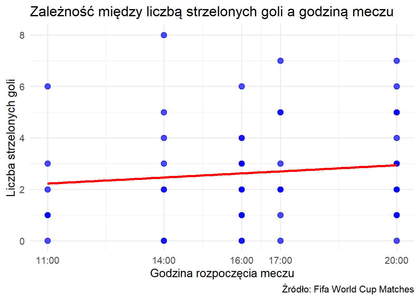 Z wykresu wynika, że istnieje subtelna tendencja wzrostu liczby strzelonych goli wraz z późniejszym rozpoczęciem meczu. Linia trendu regresji wskazuje na delikatny wzrost liczby goli w godzinach wieczornych, sugerując, że mecze odbywające się później w ciągu dnia mogą generować nieco większą liczbę bramek. Może to być wynikiem różnych czynników, takich temperatura w Katarze, czy atmosfera w późniejszych godzinach, co mogło wpływać na większą liczbę zdobytych goli.