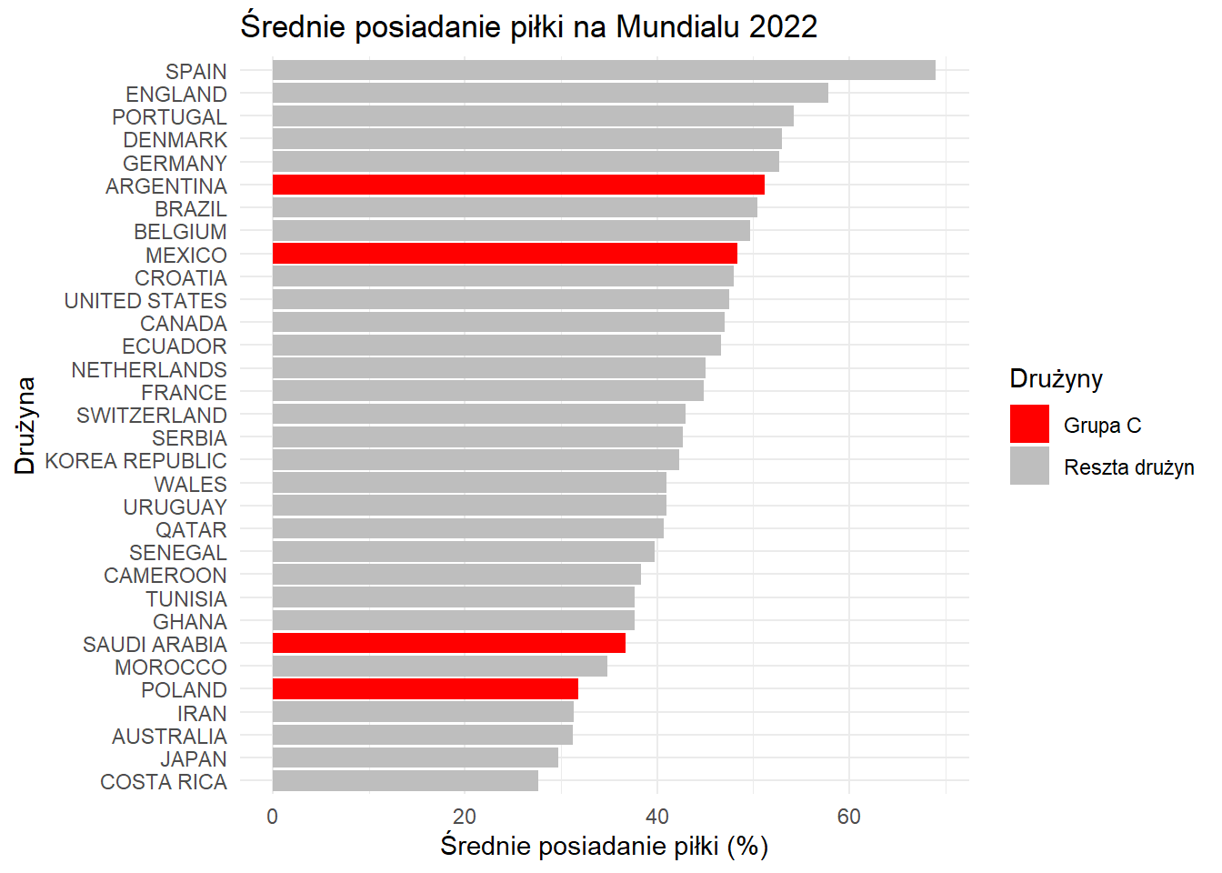 Z wykresu wynika, że reprezentacja Polski na Mundialu 2022 miała stosunkowo niskie średnie posiadanie piłki w porównaniu do innych drużyn, co może wskazywać na defensywny styl gry lub problemy z kontrolowaniem meczu. Na tle drużyn z grupy C, takich jak Argentyna czy Meksyk, Polska wyraźnie odstaje, co sugeruje, że w meczach grupowych przeciwnicy dominowali w utrzymywaniu piłki. Taki wynik może być związany z taktyką polegającą na grze z kontry, ale jednocześnie podkreśla trudności w budowaniu akcji i dyktowaniu tempa gry.