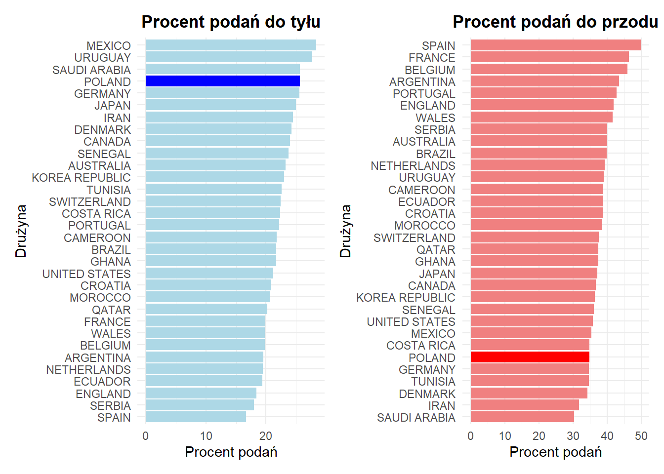 Z analizy wynika, że reprezentacja Polski wyróżnia się wysokim odsetkiem podań do tyłu w porównaniu do innych drużyn, co może sugerować defensywną taktykę lub ostrożny styl gry, skupiony na utrzymywaniu piłki w bezpiecznych strefach boiska. Jednocześnie procent podań do przodu jest u Polski niższy niż w przypadku wielu innych drużyn, co może wskazywać na trudności w kreowaniu ofensywnych akcji i budowaniu ataku. Taka charakterystyka może tłumaczyć, dlaczego Polska w wielu meczach miała problemy z przejęciem inicjatywy na boisku.