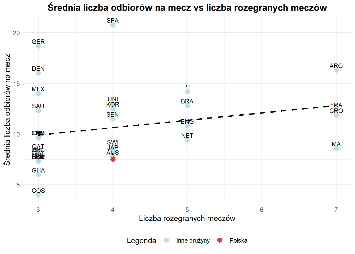 Wykres ukazuje, że reprezentacja Polski, w porównaniu do drużyn, które wyszły z grupy, prezentowała się raczej słabo pod względem liczby odbiorów na mecz. Choć Polska wyróżnia się stosunkowo wysoką średnią liczbą odbiorów w kontekście rozegranych spotkań, to jednak w zestawieniu z najlepszymi drużynami, które osiągnęły dalsze etapy turnieju, jej wynik jest bardzo przeciętny. Może to sugerować, że choć Polska była efektywna w obronie, to brak większej liczby rozegranych meczów mógł wpłynąć na dalszy rozwój tej statystyki w porównaniu do drużyn, które miały więcej doświadczeń na boisku.